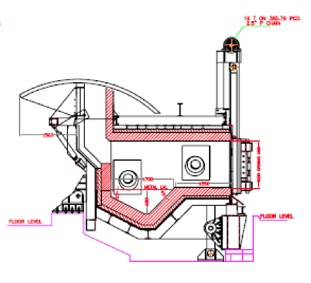 The furnace consists of a single chamber with two sections, a dry hearth section created by extending the sill of the furnace for charging and melting scrap, and a second holding section for the molten bath.